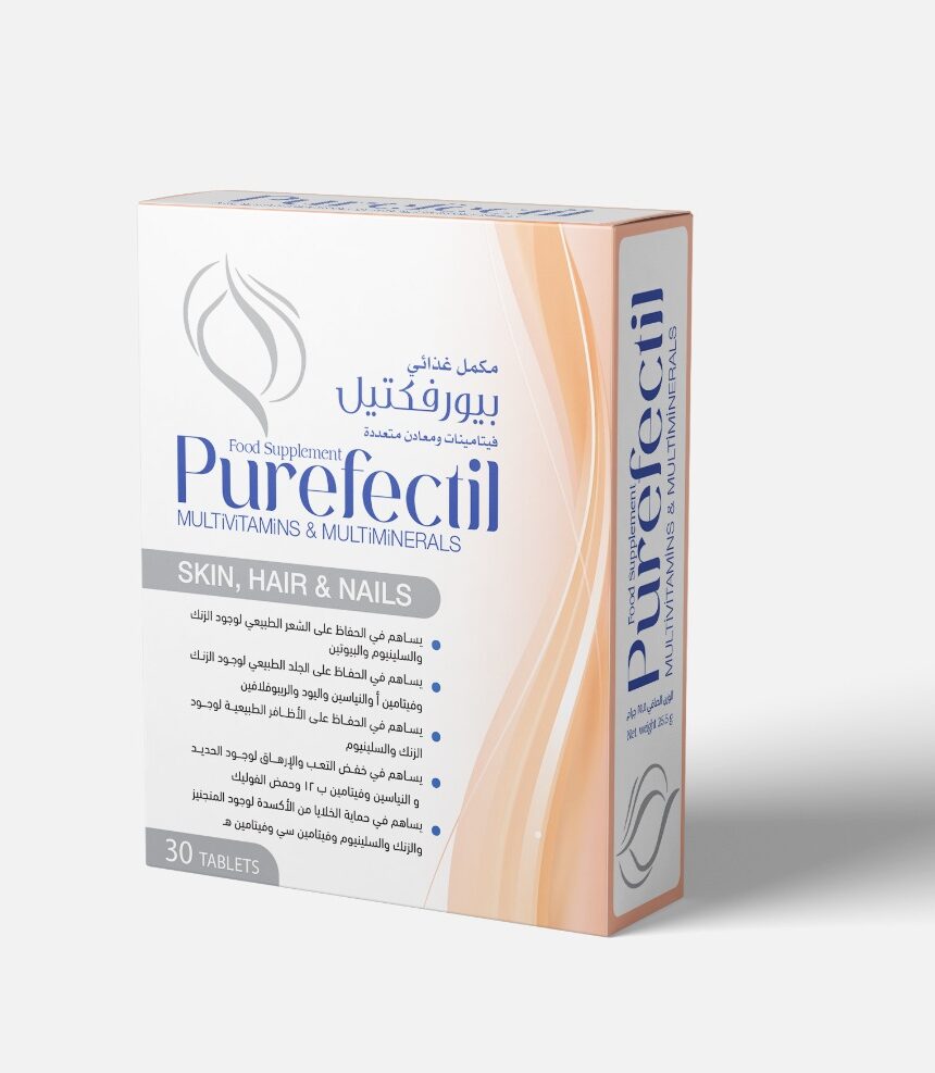 حبوب بيورفكتيل هي مكمل غذائي شامل لدعم جمال الشعر، البشرة، والأظافر. يحتوي على مجموعة من الفيتامينات والمعادن التجميلية التي تغذي البشرة والشعر والأظافر على مستويات عميقة، مما يعزز مظهرها الرائع طوال العام.